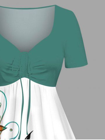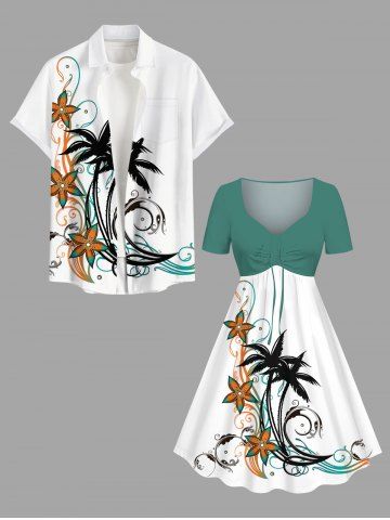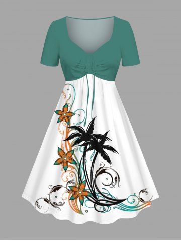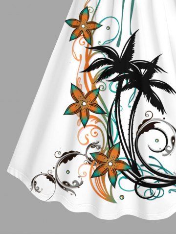 Plus Size Coconut Tree Floral Sea Waves Print Hawaii Cinched A Line Dress - White - 2x