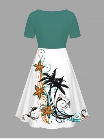 Graphic Dresses > Plus Size Coconut Tree Floral Sea Waves Print Hawaii Cinched A Line Dress