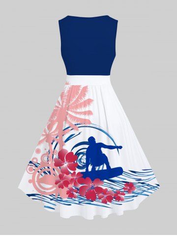 Plus Size Coconut Tree Floral Sea Waves Surfer Print Hawaii Vintage A Line Swing Dress - Multi-a - L