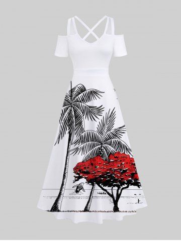 Plus Size Coconut Tree Flower Beach Print Hawaii Crisscross A Line Maxi Dress - White - 1x