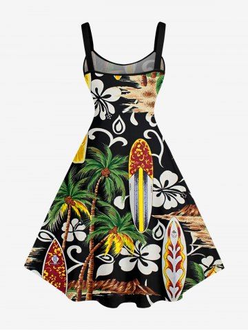 Plus Size Coconut Tree Flower Ethnic Pattern Print Hawaii A Line Dress - Black - 5x