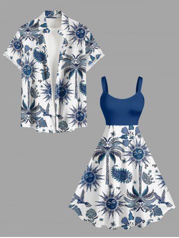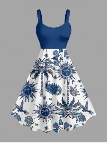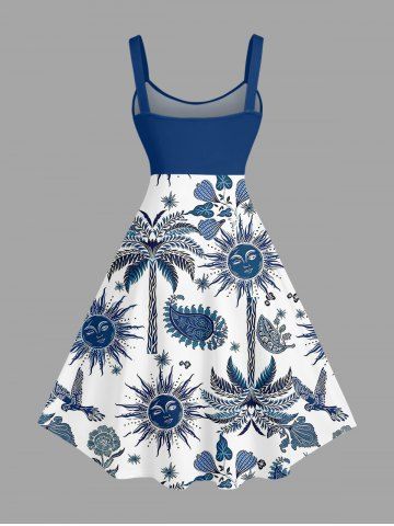 Plus Size Coconut Tree Flower Leaf Bird Sun Paisley Print Hawaii A Line Dress - Navy Blue - 6x