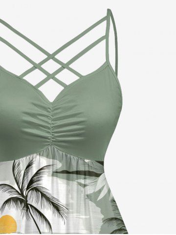 Plus Size Coconut Tree Flower Sun Print Ruched Lattice Crisscross Straps Hawaii Dress - Light Green - 6x