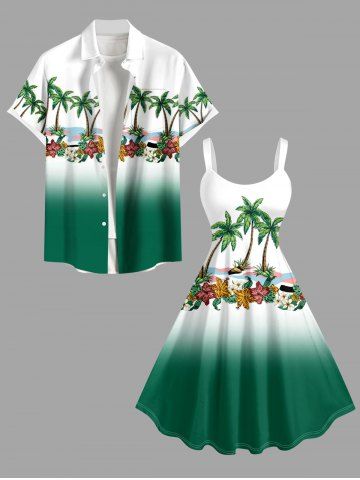 Plus Size Coconut Tree Flowers Ombre Colorblock Print Hawaii Tank Dress - Green - S