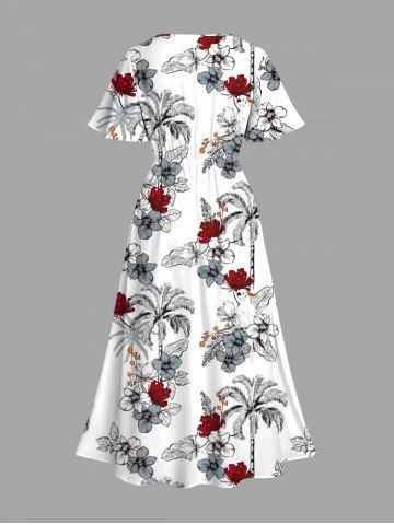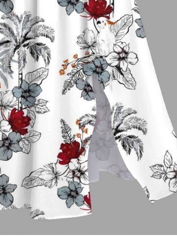 Plus Size Coconut Tree Flowers Parrot Print Split Hawaii Midi Dress - White - Xs