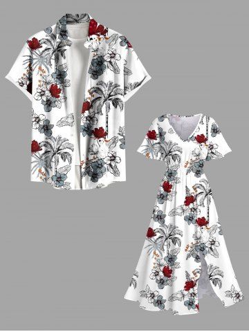 Plus Size Coconut Tree Flowers Parrot Print Split Hawaii Midi Dress - White - S