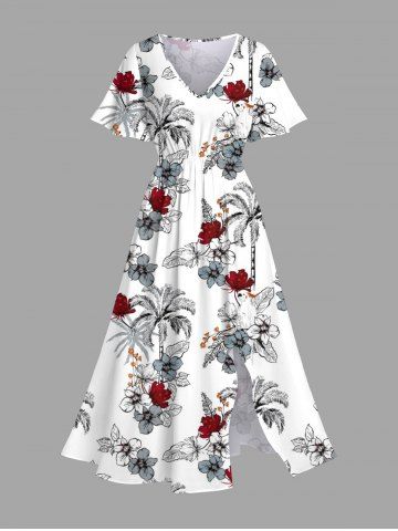 Plus Size Coconut Tree Flowers Parrot Print Split Hawaii Midi Dress - White - 1x