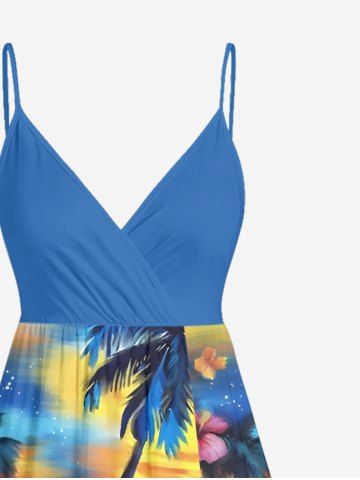 Plus Size Coconut Tree Flowers Print Surplice Hawaii Cami Dress - Indigo Color - S