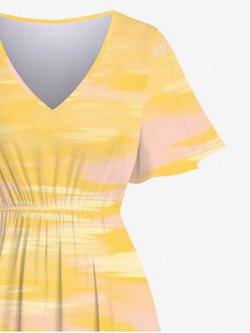 Plus Size Coconut Tree Flowers Sailboat Ombre Sky Print Hawaii Split Dress - Yellow - S