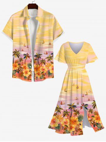 Plus Size Coconut Tree Flowers Sailboat Ombre Sky Print Hawaii Split Dress - Yellow - L