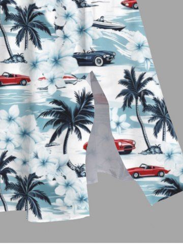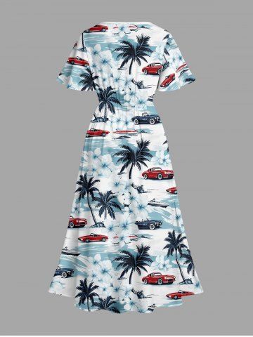 Plus Size Coconut Tree Flowers Sea Waves Car Print Split Hawaii Midi Dress - White - 3x
