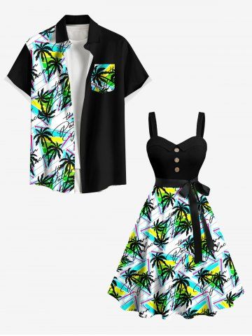 Graphic Dresses > Plus Size Coconut Tree Geometric Colorblock Letters Print Hawaii Button A Line Dress with Removable Belt
