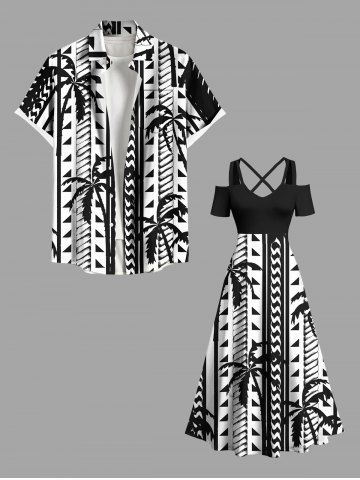 Plus Size Coconut Tree Geometric Graphic Print Hawaii Cold Shoulder Crisscross A Line Maxi Dress - Black - 1x