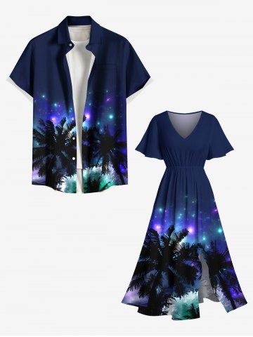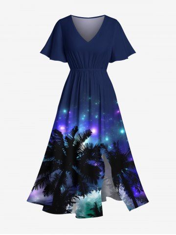Graphic Dresses > Plus Size Coconut Tree Glitter Galaxy Print Hawaii Split Pocket A Line Midi Dress