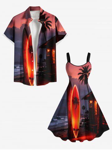 Plus Size Coconut Tree Glitter Sailboat House Sea Print Hawaii A Line Dress - Red - S