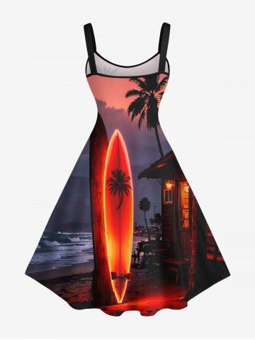 Plus Size Coconut Tree Glitter Sailboat House Sea Print Hawaii A Line Dress - Red - 6x