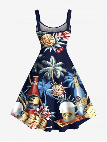 Graphic Dresses > Plus Size Coconut Tree Hibiscus Flower Beer Shell Print Hawaii A Line Tank Dress