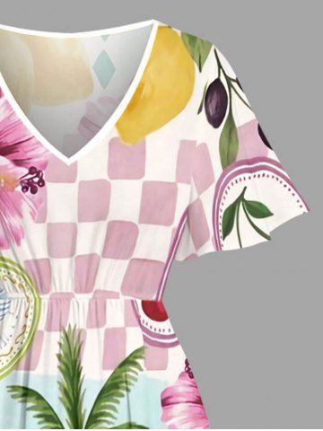 Plus Size Coconut Tree Hibiscus Flower Fruit Sun Print Hawaii Split Pocket A Line Midi Dress - Pink - 5x