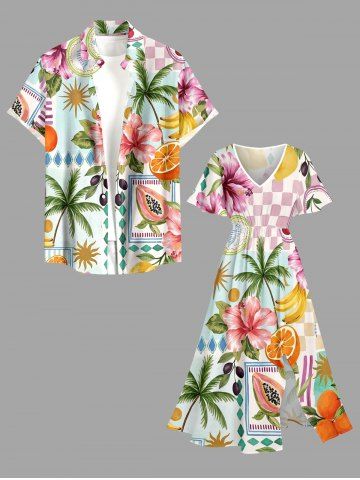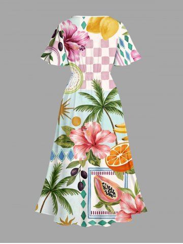 Graphic Dresses > Plus Size Coconut Tree Hibiscus Flower Fruit Sun Print Hawaii Split Pocket A Line Midi Dress