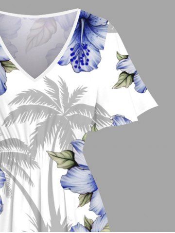 Plus Size Coconut Tree Hibiscus Flower Leaf Print Hawaii Split Pocket A Line Midi Dress - White - 2x