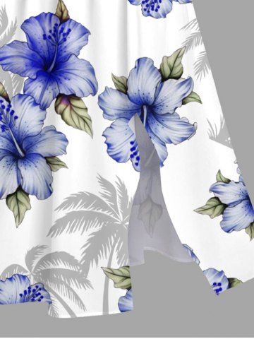 Plus Size Coconut Tree Hibiscus Flower Leaf Print Hawaii Split Pocket A Line Midi Dress - White - 4x