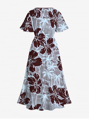 Graphic Dresses > Plus Size Coconut Tree Hibiscus Flower Print Hawaii Split Pocket A Line Midi Dress
