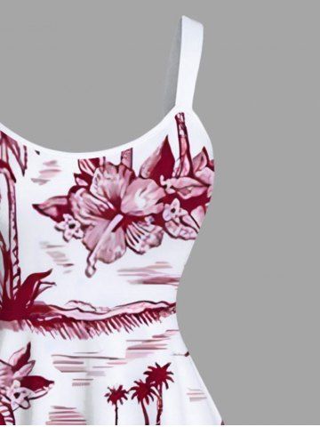 Plus Size Coconut Tree Hibiscus Flower Sea Print Hawaii A Line Tank Dress - Red - 2x