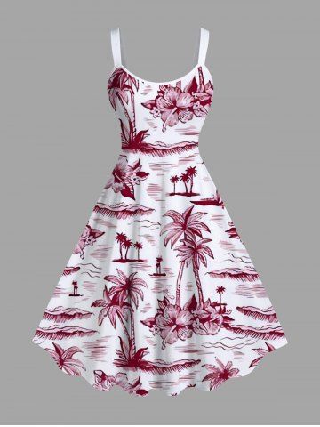 Plus Size Coconut Tree Hibiscus Flower Sea Print Hawaii A Line Tank Dress - Red - 5x