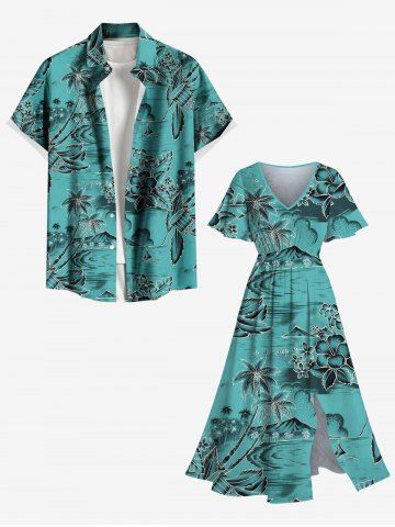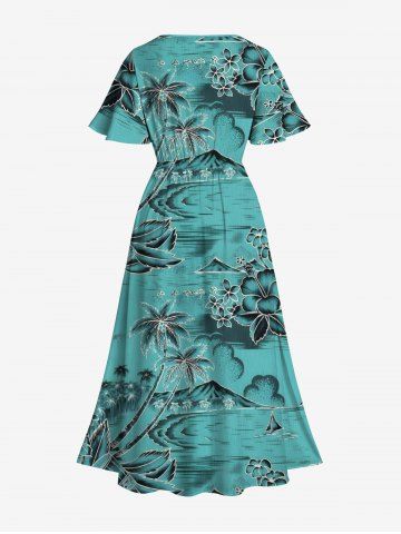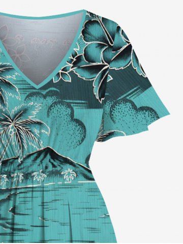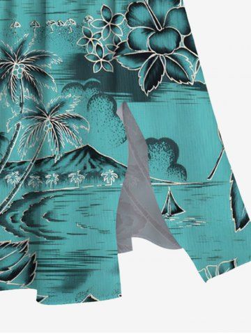 Plus Size Coconut Tree Hibiscus Flower Seascape Print Hawaii Split Pocket A Line Midi Dress - Green - 5x