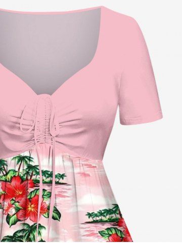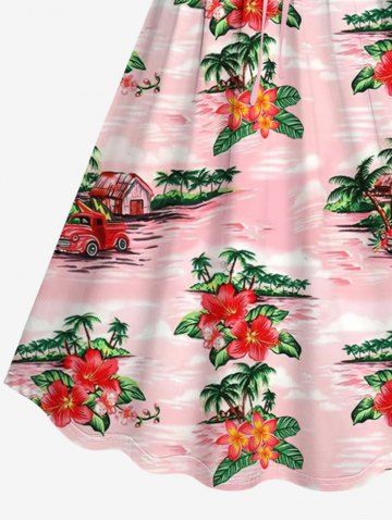 Plus Size Coconut Tree Hibiscus Flowers Car Print Cinched Hawaii Dress - Light Pink - 2x