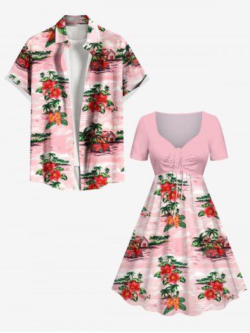 Plus Size Coconut Tree Hibiscus Flowers Car Print Cinched Hawaii Dress - Light Pink - 5x