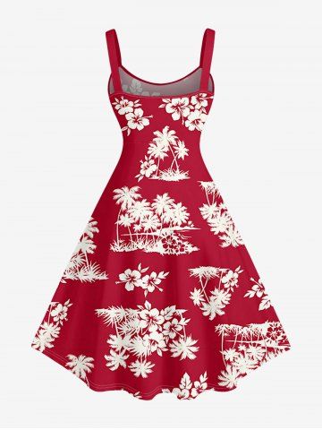 Plus Size Coconut Tree Hibiscus Flowers Print Hawaii Tank Dress - Red - S