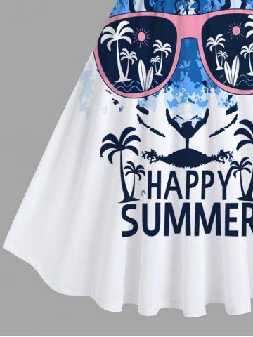 Plus Size Coconut Tree Letter Tie Dye Tiger Sunglasses Print Hawaii Vintage Swing A Line Dress - White - 2x