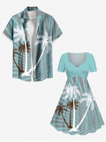 Plus Size Coconut Tree Light Beam Striped Print Hawaii Cinched A Line Dress - Green - 3x
