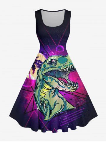 Plus Size Coconut Tree Moon Dinosaur Galaxy Print Hawaii Vintage Swing A Line Dress - Concord - Xs