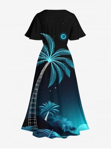 Plus Size Coconut Tree Moon Ombre Galaxy Print Split Hawaii Midi Dress - Black - Xxs