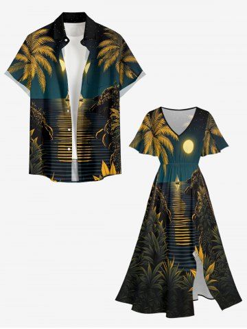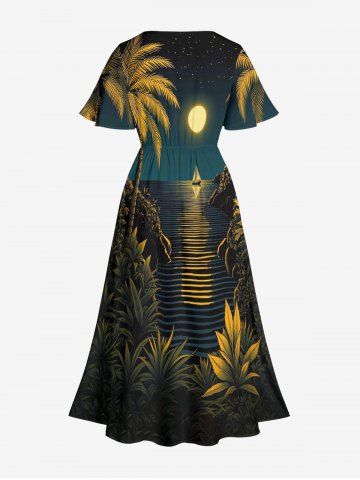 Graphic Dresses > Plus Size Coconut Tree Moon Sailboat Sea Print Split Hawaii Midi Dress