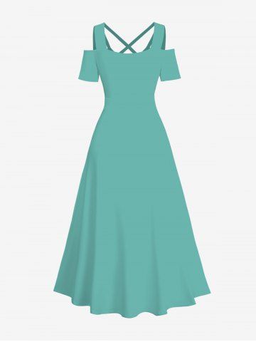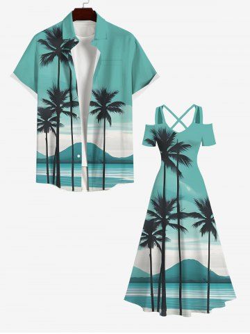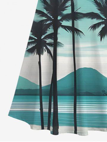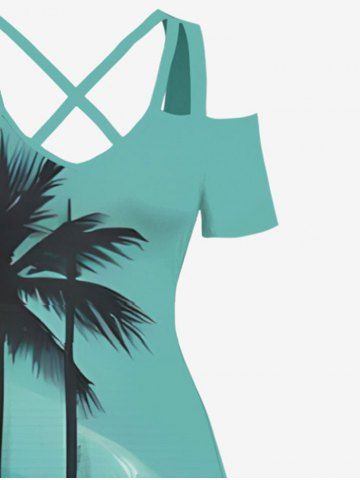 Plus Size Coconut Tree Mountain Sea Ombre Colorblock Print Cold Shoulder Crisscross Hawaii Maxi Dress - Green - 3x