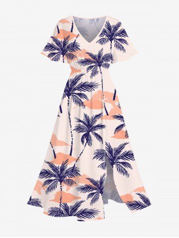 Plus Size Coconut Tree Mountains Colorblock Print Hawaii Split Midi Dress - Multi-a - 1x