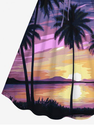 Graphic Dresses > Plus Size Coconut Tree Oil Painting Sun Sky Print Cinched Hawaii Dress