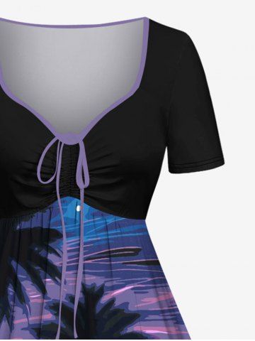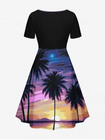 Plus Size Coconut Tree Oil Painting Sun Sky Print Cinched Hawaii Dress - Black - 1x