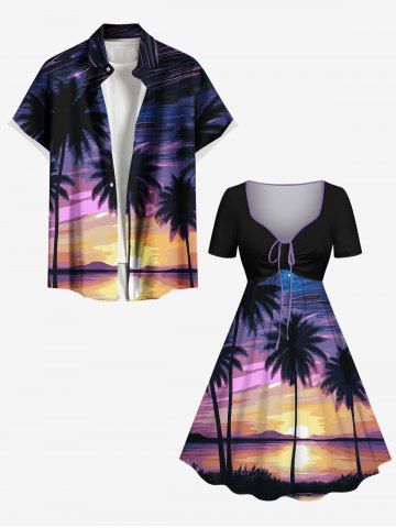 Coconut Tree Oil Painting Sun Sky Print Plus Size Matching Hawaii Beach Outfit For Couples