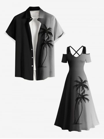 Plus Size Coconut Tree Ombre Colorblock Print Cold Shoulder Crisscross Hawaii Maxi Dress - Black - L