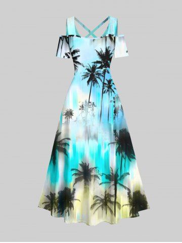 Plus Size Coconut Tree Ombre Colorblock Print Cold Shoulder Crisscross Hawaii Maxi Dress - Multi-a - 2x