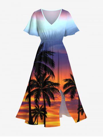 Graphic Dresses > Plus Size Coconut Tree Ombre Colorful Sky Print Split Hawaii Midi Dress