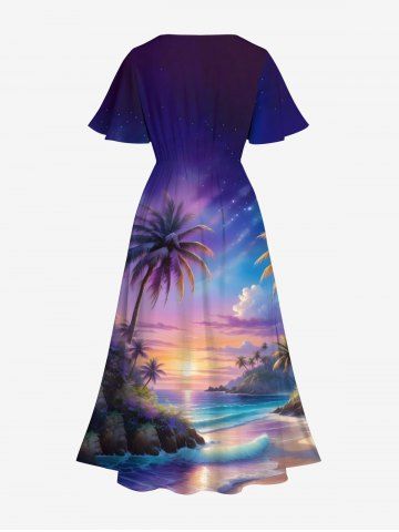 Plus Size Coconut Tree Ombre Colorful Sky Sea Print Split Hawaii Midi Dress
