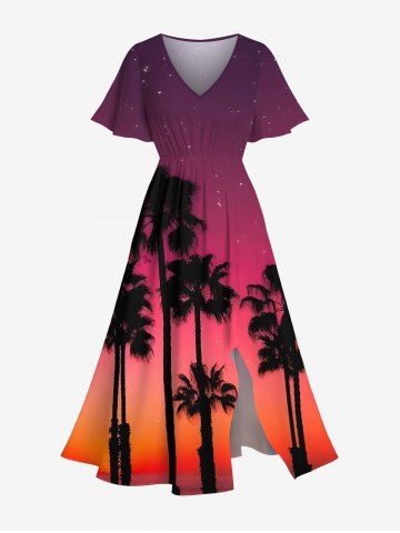 Plus Size Coconut Tree Ombre Dusk Galaxy Print Hawaii Split Pocket A Line Midi Dress - Red - M