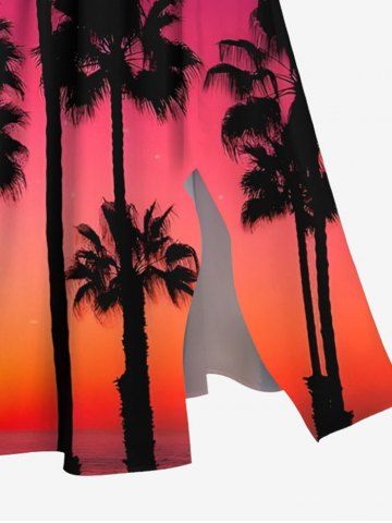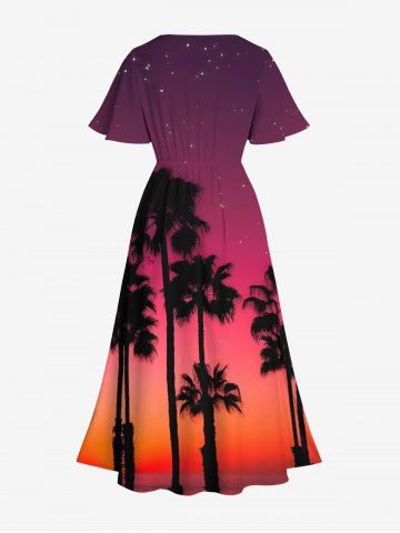 Plus Size Coconut Tree Ombre Dusk Galaxy Print Hawaii Split Pocket A Line Midi Dress - Red - 2x