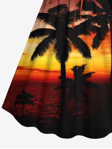 Plus Size Coconut Tree Ombre Dusk Print Hawaii Cinched A Line Dress - Black - L