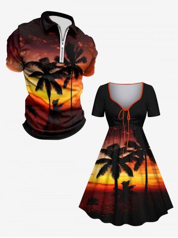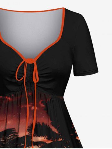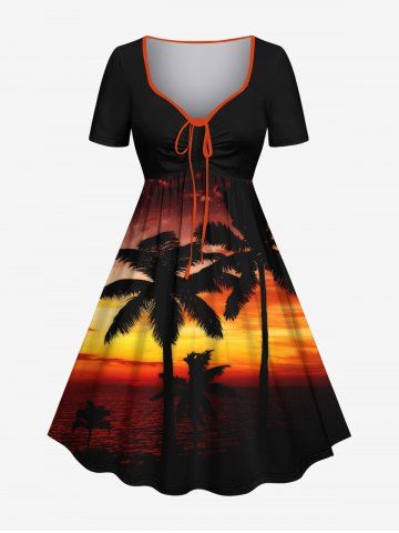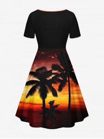 Plus Size Coconut Tree Ombre Dusk Print Hawaii Cinched A Line Dress - Black - 6x